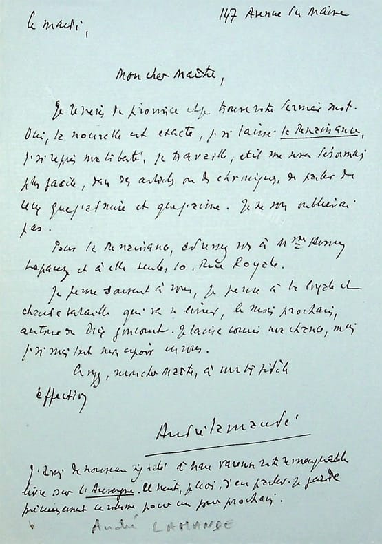 André Lamandé (1886-1933), écrivain, journaliste. L.A.S., 6 octobre 1925, 1p in-12. A l'écrivain Jean Ajalbert (1863-1947). Il confirme qu'il a quitté La Renaissance et lui dit de ne contacter que Mme Henry Lapauze dans ce journal. Il s'agit de Jeanne Loiseau, Daniel Lesueur en littérature. [385]