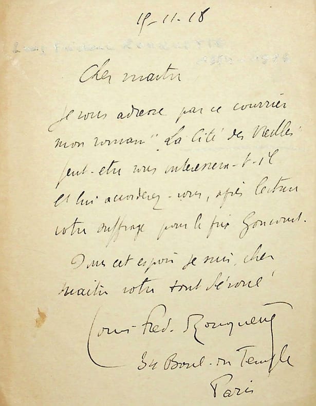 Louis-Frédéric Rouquette (1884-1926), écrivain, voyageur. L.A.S., 15 novembre 1918, 1p in-12. A l'écrivain Jean Ajalbert (1863-1947). Il lui envoie son roman, La Cité des Vieilles. « Peut-être vous intéressera-t-il et lui accorderez-vous, après lecture, votre suffrage pour le prix Goncourt ». [385]