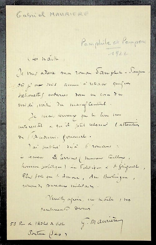 Gabriel Maurière (1873-1930), écrivain, pédagogue. L.A.S., sd [1922], 1p in-8. A l'écrivain Jean Ajalbert (1863-1947). Il lui envoie son roman, Pamphile et Pompon. « je serais heureux que le livre vous intéressât & qu'il pût retenir l'attention de l'Académie Goncourt ». [385]