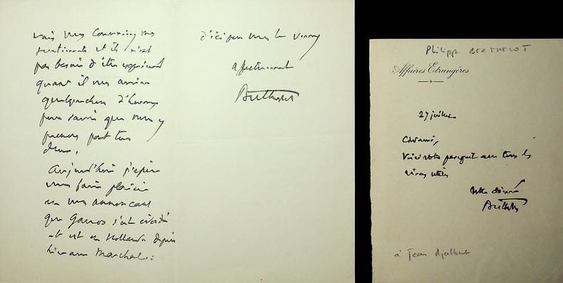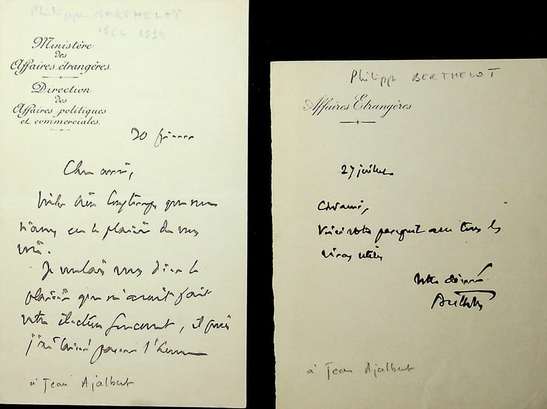 Philippe Berthelot (1866-1934), diplomate, ambassadeur aux Etats-Unis. 2 L.A.S., 20 février [1917] & 27 juillet, 3p in-12. A l'écrivain Jean Ajalbert (1863-1947). La première lettre est pour se réjouir de son élection à l'Académie Goncourt. La seconde un court billet. [385]