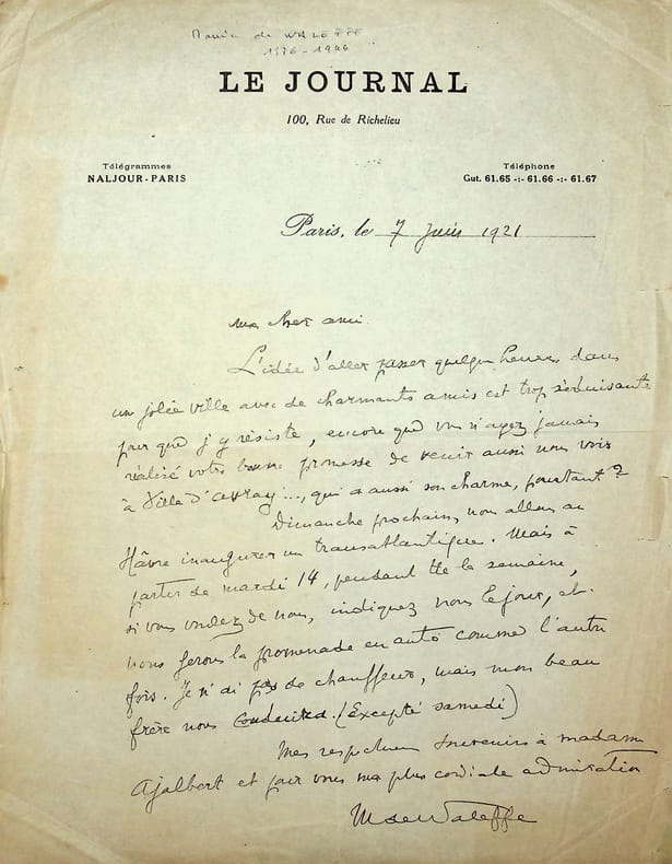 Maurice de Waleffe (1874-1946), écrivain, journaliste. L.A.S., 7 juin 1921, 1p in-4. A l'écrivain Jean Ajalbert (1863-1947). Il ne peut venir le dimanche suivant car il va au Havre pour inaugurer un transatlantique. Il peut venir la semaine suivante. [385]