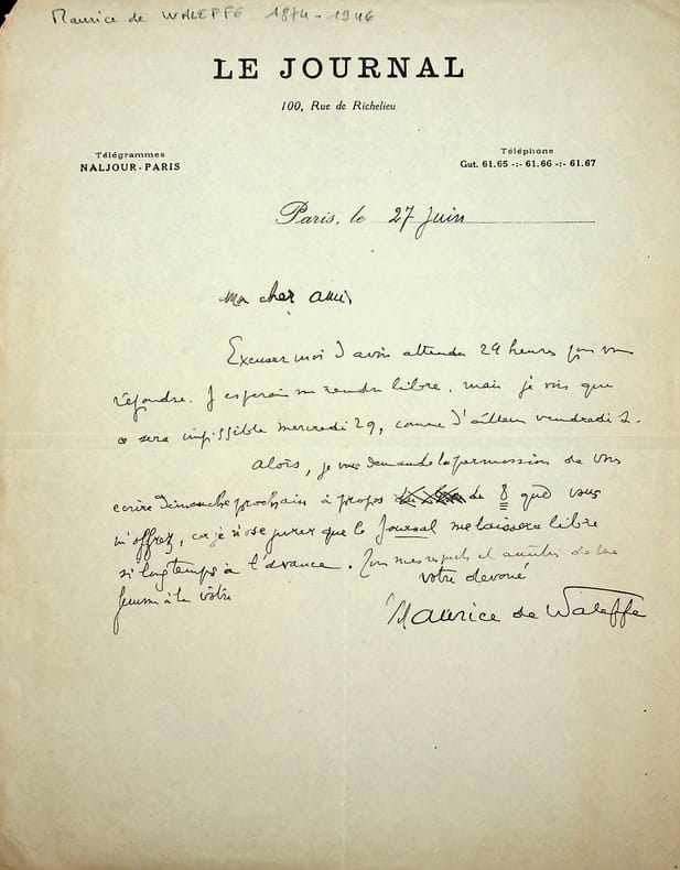 Maurice de Waleffe (1874-1946), écrivain, journaliste. L.A.S., 27 juin [1921?], 1p in-4. A l'écrivain Jean Ajalbert (1863-1947). Pour fixer un rendez-vous. [385]