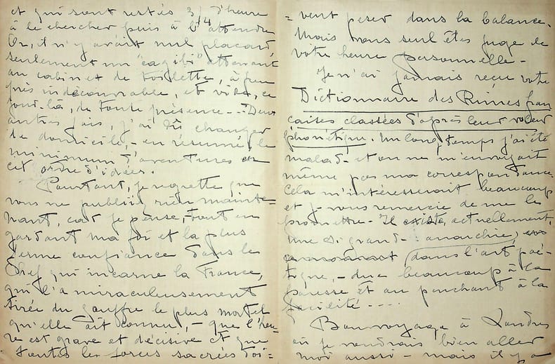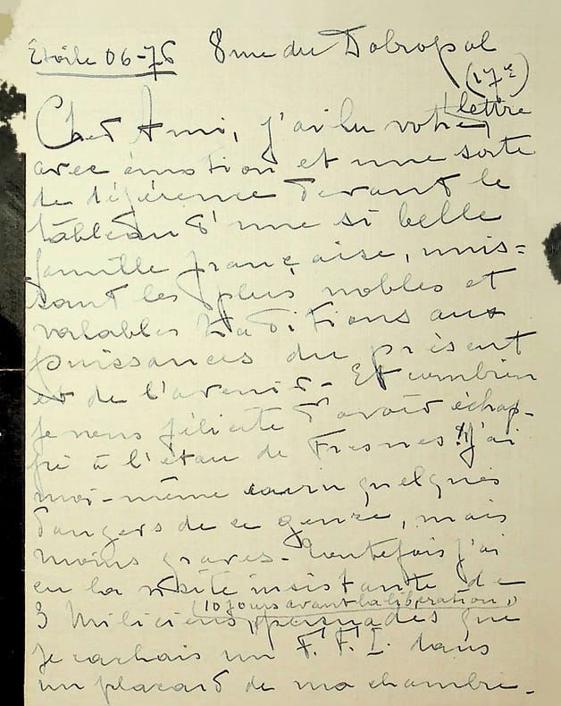 Jane Catulle-Mendès (1867-1955), poétesse. L.A.S., sd [1946], 4p in-8. Au poète Jacques Heugel (1890-1979). Très belle lettre donnant notamment une jolie anecdote : « J'ai eu la visite insistante de 3 miliciens 10 jours avant la libération, persuadés que je cachais un FFI dans un placard de ma chambre et qui sont restés 3/4 d'heure à le chercher puis à l'attendre. Or, il n'y avait nul placard, seulement un cagibi attenant un cabinet de toilette, à peu près indécouvrable, et vide, ce jour-là, de toute présence. ». Elle le remercie aussi pour son Dictionnaire de Rimes françaises. [386]