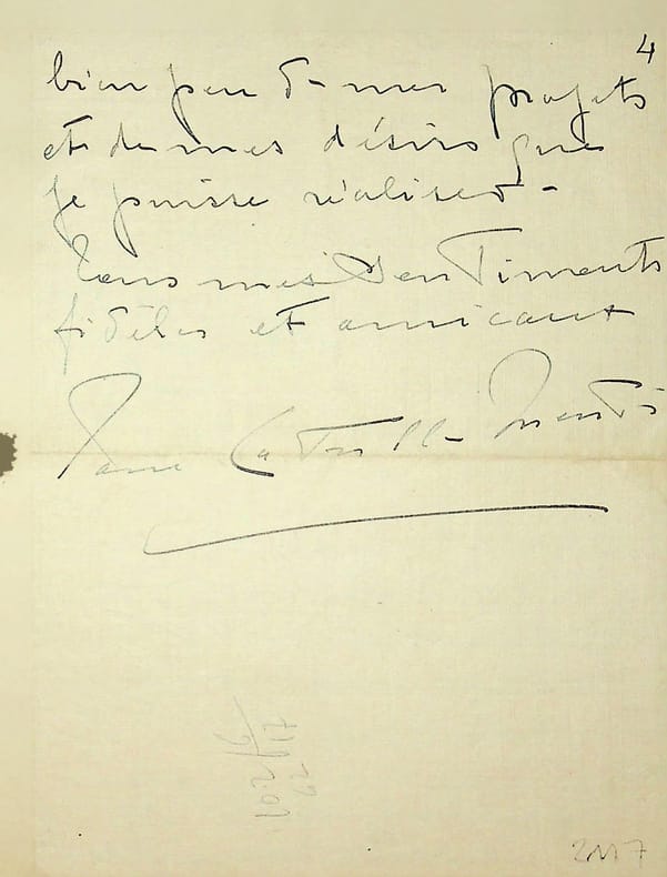 Jane Catulle-Mendès (1867-1955), poétesse. L.A.S., sd, 1p in-4. Au poète Jacques Heugel (1890-1979). « Merci, cher ami, des lignes que vous avez consacrées, avec tant d'amicale clairvoyance, à mon dernier gala de poésie. Et toutes mes cordialités mes meilleures. Jane Catulle Mendès ». [386]
