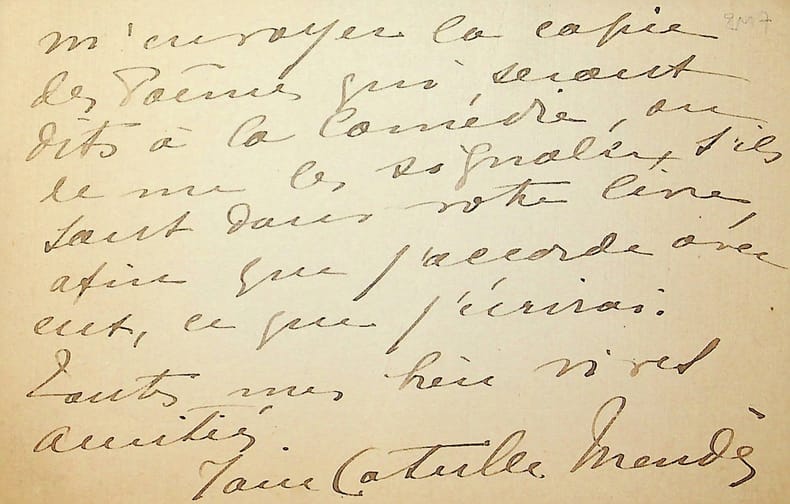 Jane Catulle-Mendès (1867-1955), poétesse. L.A.S., sd, 1p in-4. Au poète Jacques Heugel (1890-1979). « Merci, cher ami, des lignes que vous avez consacrées, avec tant d'amicale clairvoyance, à mon dernier gala de poésie. Et toutes mes cordialités mes meilleures. Jane Catulle Mendès ». [386]