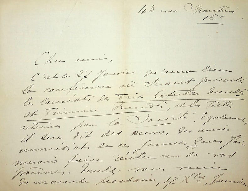 Jane Catulle-Mendès (1867-1955), poétesse. L.A.S., sd, 2p in-4. Au poète Jacques Heugel (1890-1979). « C'est le 27 janvier qu'au lieu la conférence où seront présentés les lauréats du Prix Catulle Mendès et Primice Mendès, et les poètes retenus par la Société. Egalement il sera dit des oeuvres des amis immédiats de ces jeunes gens. J'aimerais faire réciter un de vos poèmes. Voulez-vous venir dimanche prochaine, 17 décembre, prendre le thé à 5h avec Mme Jacques Heugel, afin que nous choisissions ensemble ce poème et votre interprête ». Deux déchirures. [386]