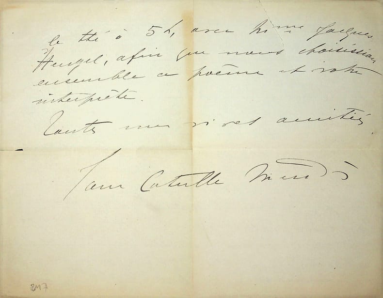 Jane Catulle-Mendès (1867-1955), poétesse. L.A.S., sd, 1p in-4. Au poète Jacques Heugel (1890-1979). « Merci, cher ami, des lignes que vous avez consacrées, avec tant d'amicale clairvoyance, à mon dernier gala de poésie. Et toutes mes cordialités mes meilleures. Jane Catulle Mendès ». [386]