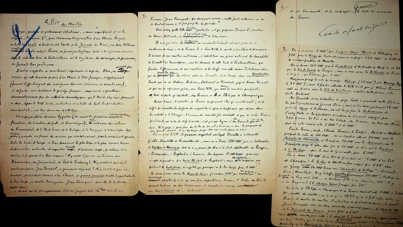 Camille de Sainte-Croix (1859-1915), écrivain, journaliste. Manuscrit A.S., sd (avant 1913), 3p 1/4 in-4. Article « Le Prix des Maîtres », sur la peinture de François Ier à LouisXIV et les prix atteints. Cet article a bien été publié, puisqu'on en trouve la trace dans la Bibliothèque universelle et revue suisse (1913, tome LXX, p.619) mais nous n'avons pas trouvé où. Peu commun. [386]
