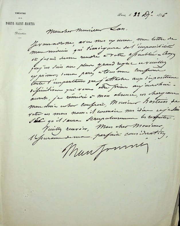 Marc Fournier (1818-1879), directeur du théâtre de la Porte Saint-Martin. L.A.S., 22 décembre 1856, 1p in-4. Il ne peut se rendre à une assemblée en raison de sa santé, joint une lettre de son médecin et charge M. Hostein (?) de voter pour lui. [386]