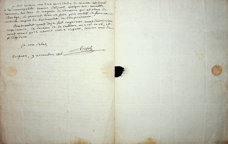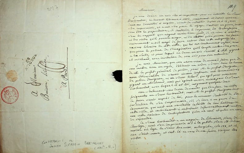 [Joseph-Siffrein Bertrandet, libraire à Paris et Avignon] Cristol. L.A.S., Avignon, 9 novembre 1806, 1p 1/2 in-4. Extraordinaire lettre de dénonciation au libraire François Buisson (1753-1814) à Paris. L'auteur, Cristol y dénonce longuement Bertrandet (1771?-18..), ancien libraire à Paris, qui a mis sous presse « Le voyage d'Anténor en Grèce » dont Buisson est l'éditeur. Il a essayé, sans succès, « de faire entrer dans cette entreprise les anciens libraires » d'Avignon. Il lui indique ce qu'il faut faire pour contrer Bertrandet, tout en précisant exactement le lieu de son « magasin de librairie, place de l'horloge » et celui de son imprimerie « petite place St Didier, maison où loge le sieur Tramier, aubergiste, Isle 128, n°16, rue Saint Marc ». « Et c'est là où vous devez faire diriger les visites ». Il précise que la boutique lui est louée par un « honorable homme » qui est toutefois adjoint du maire. On trouve un Barthélémy (Bartolomei) Cristol (Christol), cavalier de maréchaussée, dont la fille Marie épouse à Avignon en 1779 Jean-Joseph Hill, autre cavalier de la maréchaussée. On peut supposer que ce Cristol a un lien avec ces personnages, peut-être un autre membre de la maréchaussée. On trouve la trace de Bertraudet dans une autre affaire de contrefaçon, qu'il gagna car le libraire plaignant n'avait pas fait le nécessaire pour protéger son travail. Très intéressant courrier. [386]