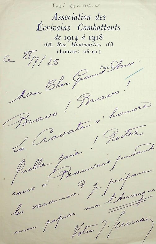 José Germain (1884-1964), écrivain. L.A.S., 28 juillet 1925, 1p in-8. A l'écrivain Jean Ajalbert (1863-1947). Félicitations pour sa promotion comme Commandeur de la Légion d'Honneur (même si le décret est officiellemenbt publié le 31) : « Mon cher Grand Ami. Bravo ! Bravo ! La Cravate s'honore. Quelle joie ! Restez-vous à Beauvais pendant les vacances ? Je prépare mon papier sur l'Auvergne. Votre J Germain ». [386]