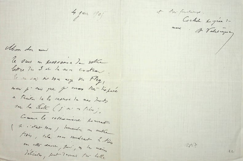 Antony Valabrègue (1844-1900), poète, critique d'art. L.A.S., 4 juin 1905, 1p 1/4 in-8. Lettre à propos de droits sur « la Bête » dont il a un tiers des droits et dont un gestionnaire pourrait lui obtenir un autre tiers. « cette oeuvre, en des mains délicates, peut devenir très belle et très fructueuse ». S'agit-il des droits de La Bête humaine de Zola ? Ce serait curieux mais Zola et lui étaient amis de longue date. [386]