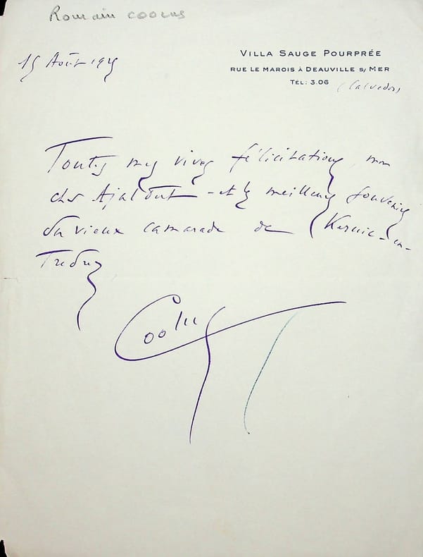 Romain Coolus (1868-1952), écrivain. L.A.S., 15 août 1925, 1p in-8. A l'écrivain Jean Ajalbert (1863-1947). Félicitation pour sa Légion d'Honneur. [387]