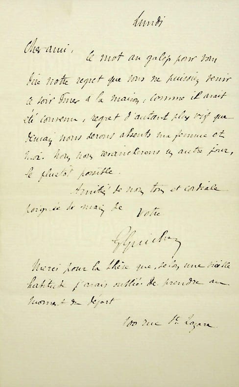 Gustave Guiches (1860-1935), écrivain. L.A.S., sd [lundi, 1888-1889], 1p in-8. Au docteur et écrivain Maurice de Fleury (1860-1931). Regrets pour un diner auquel Fleury ne pourra venir. [388]