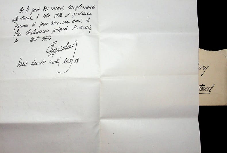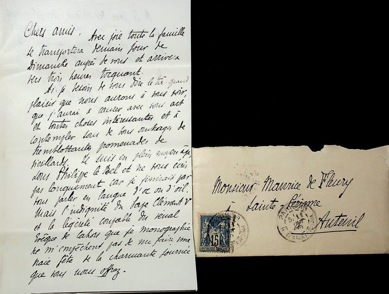 Gustave Guiches (1860-1935), écrivain. L.A.S. + enveloppe, 11 août 1888, 1p 1/2 in-8. Au docteur et écrivain Maurice de Fleury (1860-1931). Sympathique lettre amicale acceptant une invitation pour le lendemain. Il mentionne aussi sa monographie en cours d'écriture autour de Philippe Le Bel, Clément V (parlant de son « indignité ») et de l'évêque de Cahors (« la légèreté coupable du vénal évêque »). Nous n'avons pas trouvé de quelle monographie il s'agissait. [388]