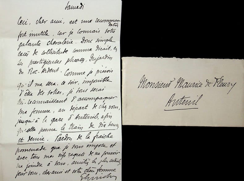 Gustave Guiches (1860-1935), écrivain. L.A.S. + enveloppe, sd [1899], 1p in-8. Au docteur et écrivain Maurice de Fleury (1860-1931). Il ne pourra venir le soir et lui demande de raccompagner sa femme au train. Il dit aussi : « simple excès de sollicitude comme dirait, en ses prestigieuses phrases, Dujardin du Roc-Ardent ». C'est-à-dire Edouard Dujardin, auteur de Pour la vierge du roc ardent en 1899. [388]