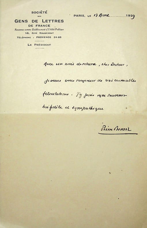 Pierre Benoit (1886-1962), écrivain, membre de l'Académie française. L.A.S., Paris, 17 avril 1909, 1/2p in-8. Au docteur et écrivain Maurice de Fleury (1860-1931). Remerciements pour des félicitations, probablement suite à l'élection de Benoit comme président de la Société des Gens de Lettres. [388]