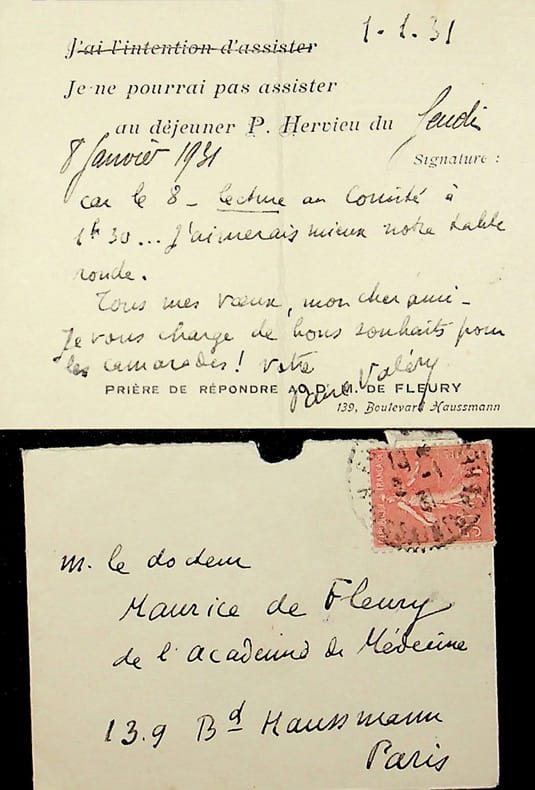 Paul Valéry (1871-1941), poète, écrivain, philosophe. L.A.S. + enveloppe, 1er janvier 1931], 6 lignes. Au docteur et écrivain Maurice de Fleury (1860-1931), sur un carton d'invitation au « déjeuner P. Hervieu », plié pour entrer dans la petite enveloppe. [je ne pourrai pas assister] « car le 8 - lecture au Comité à 1h30. j'aimerais mieux notre table ronde. Tous mes voeux, mon cher ami. Je vous charge de bons souhaits pour les camarades. Votre Paul Valéry ». Le déjeuner Paul Hervieu était un cercle littéraire. Barthou, Carco, Bérard et Pétain en ont aussi fait partie. [388]