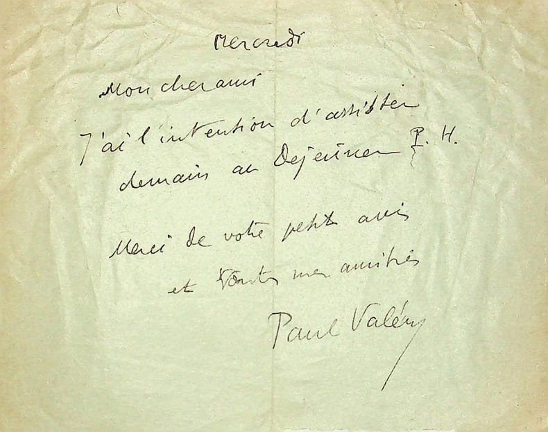 Paul Valéry (1871-1941), poète, écrivain, philosophe. L.A.S., 4 décembre 1929, 1p in-12. Au docteur et écrivain Maurice de Fleury (1860-1931). « Mon cher ami, J'ai l'intention d'assister demain au déjeuner P.H. [Paul Hervieu]. Merci de votre petit avis et toutes mes amitiés. Paul Valéry ». Le déjeuner Paul Hervieu était un cercle littéraire. Barthou, Carco, Bérard et Pétain en ont aussi fait partie. [388]