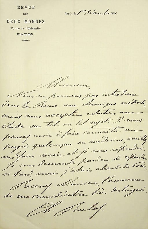 Charles Buloz (1843-1905), journaliste. L.A.S., Paris, 1er décembre 1891, 1p in-8. Au docteur et écrivain Maurice de Fleury (1860-1931). La Revue des Deux Mondes ne peut introduire de chronique médicale mais accepter les articles ponctuels sur le sujet. [388]