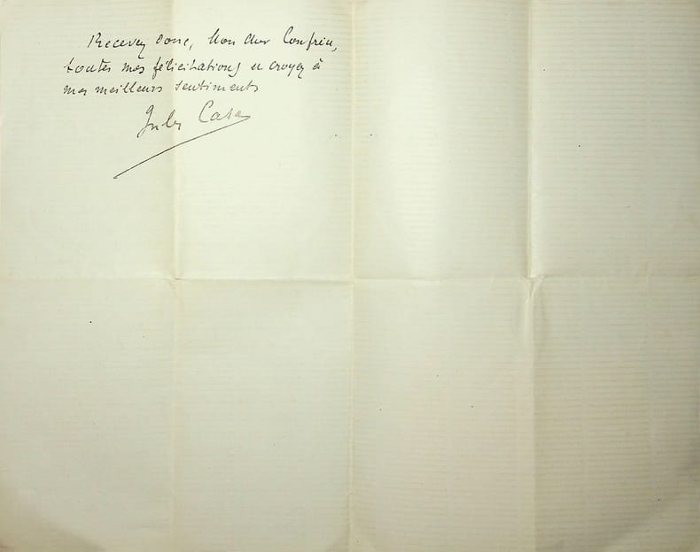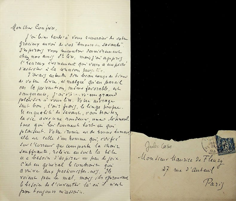 Jules Case (1854-1931), écrivain, journaliste. L.A.S. + enveloppe, 7 janvier 1891, 1p1/4 in-8. Au docteur et écrivain Maurice de Fleury (1860-1931). Belle lettre de remerciements pour son livre Amours de Savants. « votre ouvrage sent bon, l'air frais, le linge propre [.] votre ironie est de bonne humeur, elle est celle d'un homme qui, édifié sur l'horreur que comporte la chair souffrante, relève ensuite la tête et a besoin d'aspirer un peu de joie. ». Belle lettre. [389]