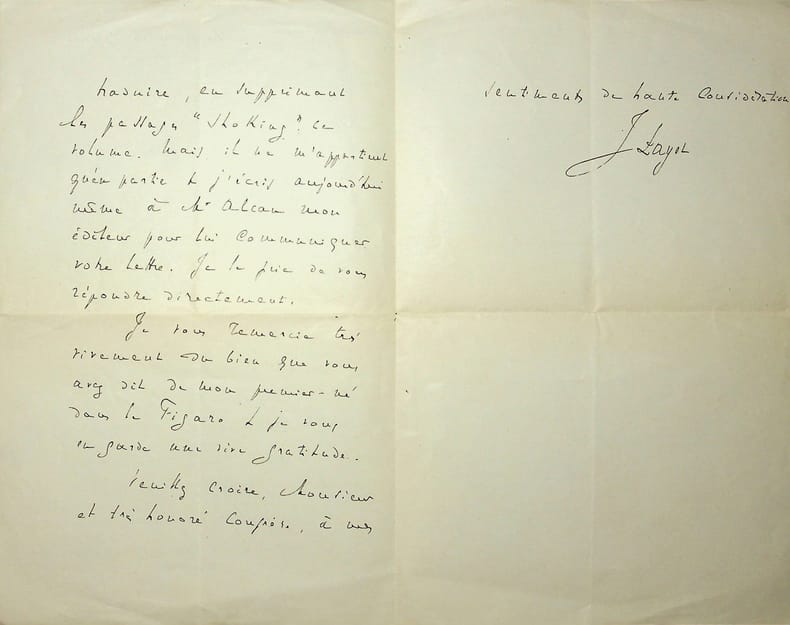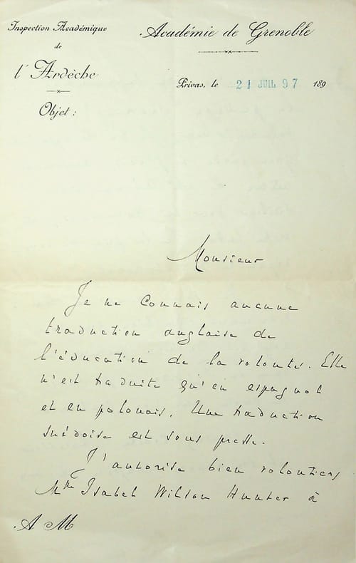 Jules Payot (1859-1940), pédagogue, universitaire. L.A.S., Privas, 21 juillet 1897, 2p 1/4 in-8. Au docteur et écrivain Maurice de Fleury (1860-1931). Belle lettre autorisant la traduction de son principal ouvrage, L'éducation de la volonté, en langue anglaise. Il autorise ainsi Mme Isabel Wilson Hunter à en être l'auteur. Toutefois, si une traduction anglaise fut bien publiée, il ne semble pas que ce fut avec cette traductrice. L'ouvrage fut traduit dans plusieurs dizaines de langues et est toujours édité. Belle lettre, peu commun. [389]