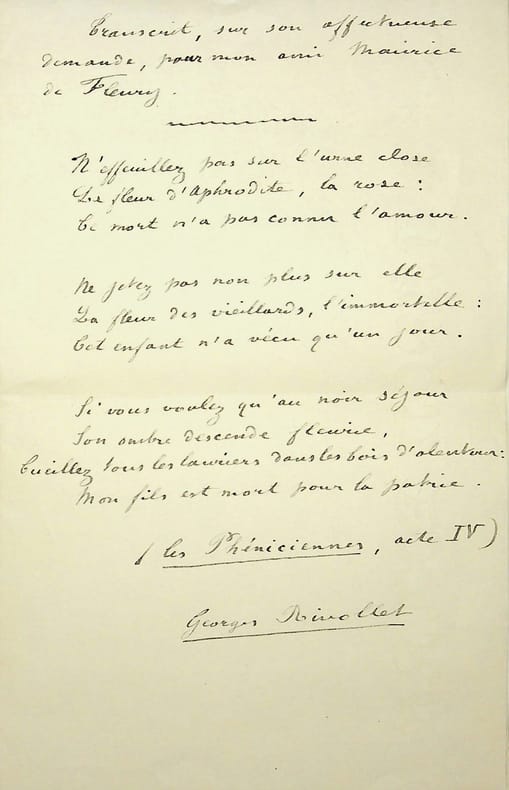 Georges Rivollet (1852-1928), écrivain. P.A.S., sd, 1p in-8. Au docteur et écrivain Maurice de Fleury (1860-1931). Extrait de sa pièce de théâtre Les Phéniciennes, publiée en 1903. Extrait de l'acte IV. [389]