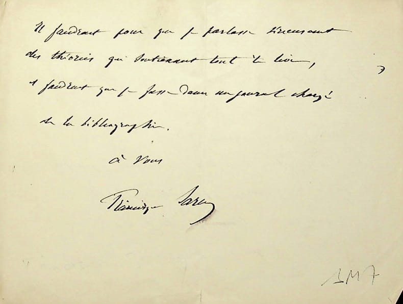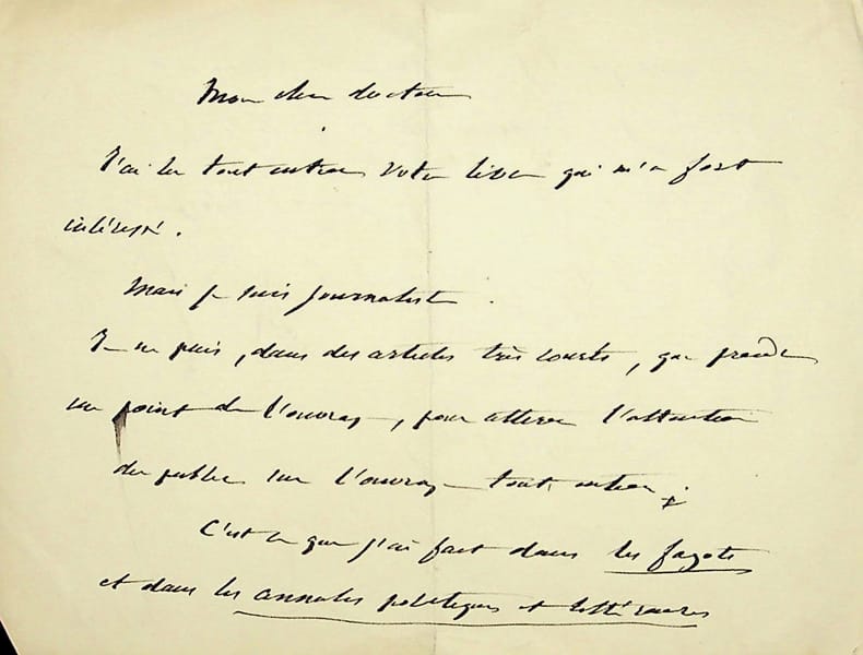 Francisque Sarcey (1827-1899), écrivain, journaliste. L.A.S., sd, 2p in-12. Au docteur et écrivain Maurice de Fleury (1860-1931). Il a lu son livre mais ne peut en parler que de manière très courtes, ce qu'il a fait dans deux journaux : Les Fagots et les Annales politiques et littéraires. [389]