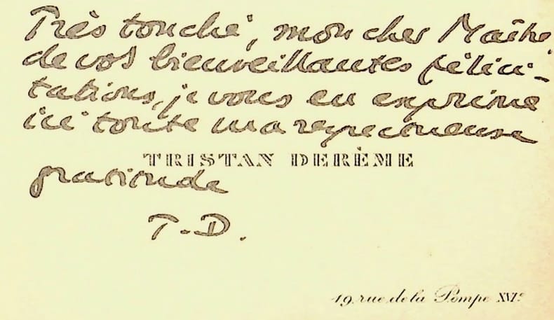 Tristan Derème (1889-1941), poète. L.A.S., sd, 5 lignes. Au docteur et écrivain Maurice de Fleury (1860-1931). « Très touché, mon cher Maître, de vos bienveillantes félicitations, je vous en exprime ici toute ma respectueuse gratitude. T.D. ». [389]