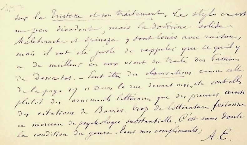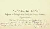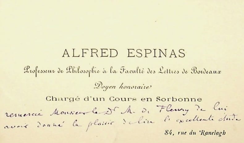 Alfred Espinas (1844-1922), philosophe, sociologue. C.A.S., sd, R°V°. Au docteur et écrivain Maurice de Fleury (1860-1931). Alfred Espinas « remercie Monsieur le Dr M de Fleury de lui avoir donné le plaisir de lire l'excellent étude sur la Tristesse et son traitement. Le style en est un peu décadent, mais la doctrine solide. Malebranche et Spinoza y sont loués avec raison, mais il eut été plus juste de rappeler que ce qu'il y a de meilleur en eux vient du traité des Passions de Descartes. Peut-être des observations comme celle de la page 17 "Dans le rue devant moi" etc sont-elles plutôt des ornements littéraires que des preuves. Ainsi des citations de Barrès. Trop de littérature festonne ce morceau de psychologie substantielle. C'est sans doute la condition du genre. Tous mes compliments. A.E. ». Peu commun, joli courrier. [389]