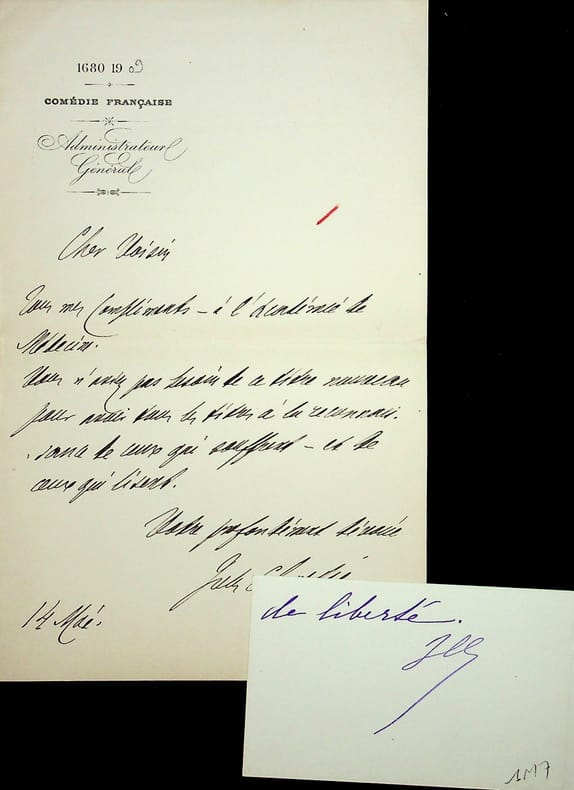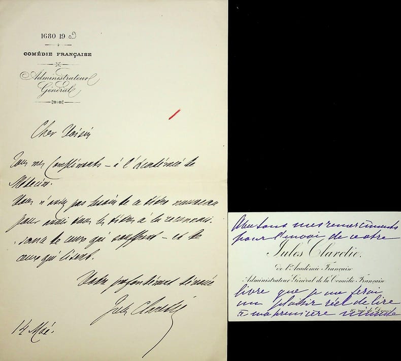 Jules Claretie (1840-1913), écrivain. L.A.S., 14 mai 1909, 1P in-8. Au docteur et écrivain Maurice de Fleury (1860-1931). Félicitations pour son élection à l'Académie de Médecine (11 mai). On joint une C.A.S., sd, remerciements pour un livre. [390]