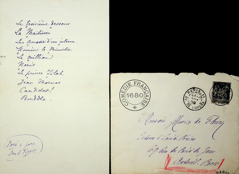 Jules Claretie (1840-1913), écrivain. P.A., sd, 1p in-8. Au docteur et écrivain Maurice de Fleury (1860-1931). Liste d'oeuvres de Claretie, probablement indiquées à Fleury pour un article. 10 oeuvres sont indiquées : Le troisième dessous, La Maitresse, Les amours d'un interne, Monsieur le Ministre, Le Million, Noris, Le prince Zilah, Jean Mornas, Candidat ! & Bouddha. Ces oeuvres ont paru entre 1878 et 1888. On joint une enveloppe d'octobre 1889. [390]