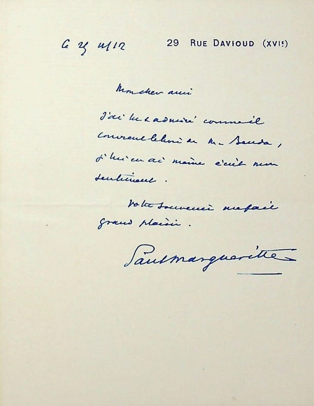 Paul Margueritte (1860-1918), écrivain. L.A.S., 25 novembre 1912, 1p in-12. Au docteur et écrivain Maurice de Fleury (1860-1931). « J'ai lu et admiré comme il convient le livre de M Benda. » [390]