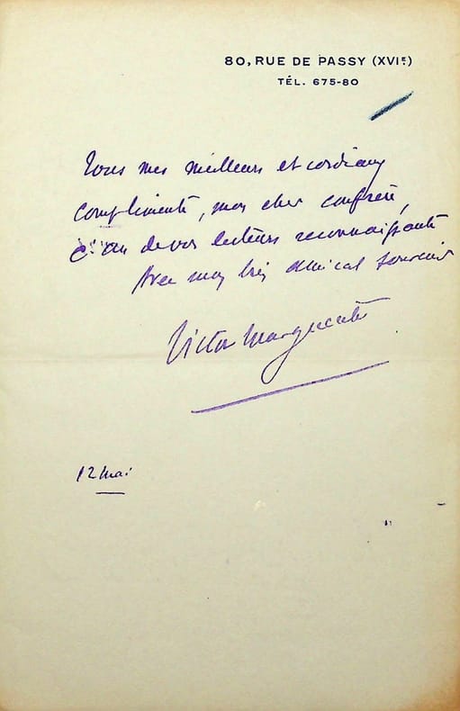 Victor Margueritte (1866-1942), écrivain. L.A.S., 12 mai, 1p in-12. Au docteur et écrivain Maurice de Fleury (1860-1931). remerciements [390]
