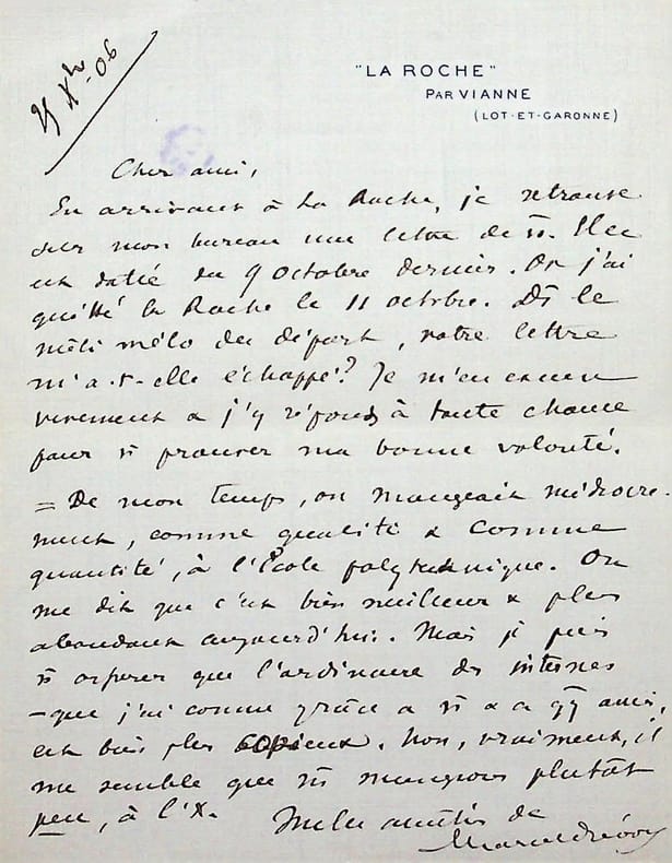 Marcel Prévost (1862-1941), écrivain, membre de l'Académie française. L.A.S., 25 décembre 1906, 1p in-12. Au docteur et écrivain Maurice de Fleury (1860-1931). Amusante lettre dans laquelle il précise que de son temps, on mangeait peu à l'Ecole Polytechnique : « on mangeait médiocrement, comme qualité & comme quantité ». [390]