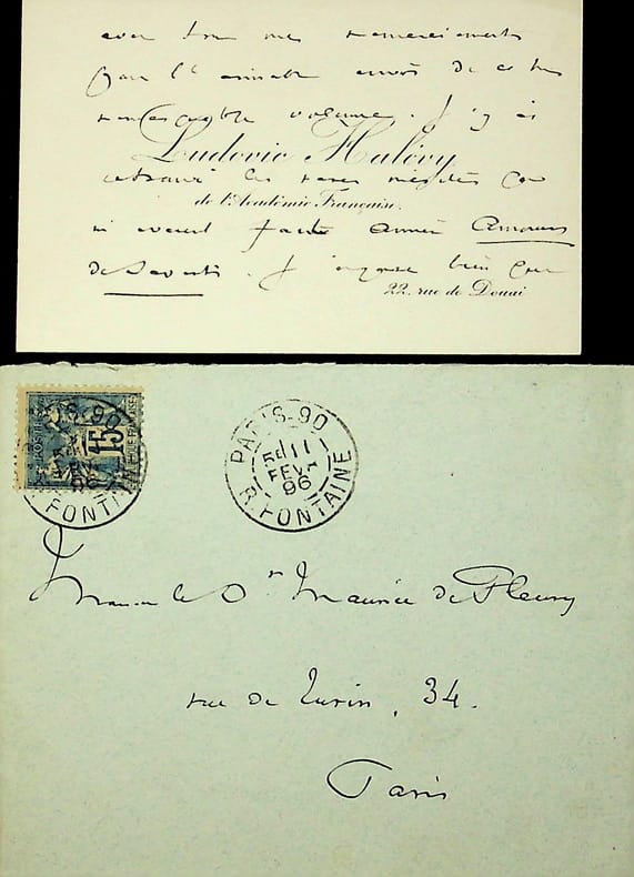 Ludovic Halévy (1834-1908), écrivain, librettiste, membre de l'Académie française. C.A.S., sd [1891], R°V°. Au docteur et écrivain Maurice de Fleury (1860-1931). Remerciements pour un envoi de volumes dont Amours de Savants. On joint une enveloppe du 11 février 1896. [391]