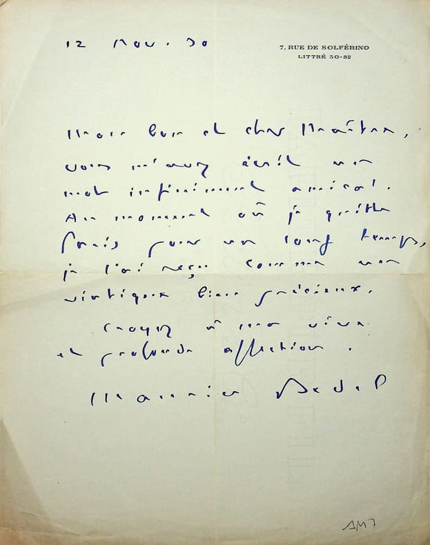 Maurice Bedel (1883-1954), écrivain. L.A.S., 12 novembre 1930, 1p in-4. Au docteur et écrivain Maurice de Fleury (1860-1931). Remerciements pour une lettre amicale. [391]