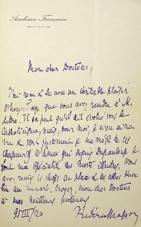 Frédéric Masson (1847-1923), historien, membre de l'Académie française. L.A.S., 9 mars 1920, 1p in-8. Au docteur et écrivain Maurice de Fleury (1860-1931). Amusante lettre : « J'ai reçu et lu avec un véritable plaisir l'hommage que vous avez rendu à M. Littré. Il se peut qu'il ait évolué vers le catholicisme, mais, pour moi, je n'en ai rien vu & fort justement, je me méfie de ces chasseurs d'âmes qui depuis Dupanloup se font une spécialité des morts illustres. Vous avez remis les choses en place & les abbés Huvelin au rancart. Croyez, mon cher Docteur, à mes meilleurs sentiments. Frédéric Masson ». L'abbé Huvelin avait été le directeur de conscience d'Emile Littré qu'il a baptisé sur son lit de mort. [391]