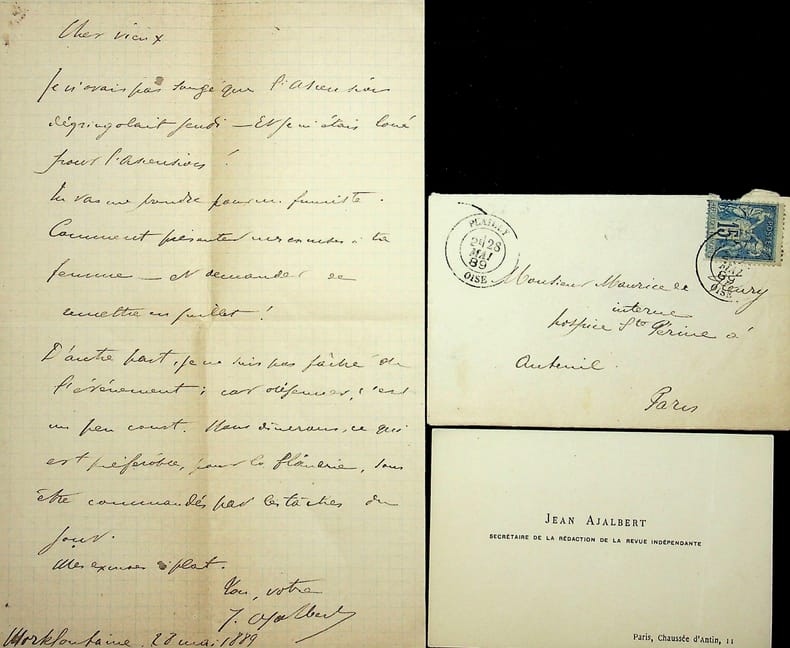 Jean Ajalbert (1863-1947), écrivain, avocat, membre de l'Académie Goncourt. L.A.S. + enveloppe, 28 mai 1889, 1p in-8. Au docteur et écrivain Maurice de Fleury (1860-1931). A propos d'un rendez-vous manqué : « je n'avais pas songé que l'Ascension dégringolait jeudi - et je m'étais loué pour l'Ascension. Tu vas me prendre pour un fumiste. ». [391]