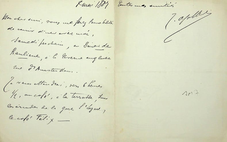 Jean Ajalbert (1863-1947), écrivain, avocat, membre de l'Académie Goncourt. L.A.S., 8 mai 1887, 1p 1/4 in-12. Au docteur et écrivain Maurice de Fleury (1860-1931). Invitation à dîner. Lettre précoce. Ajalbert n'a publié qu'un unique livre à cette date. [391]