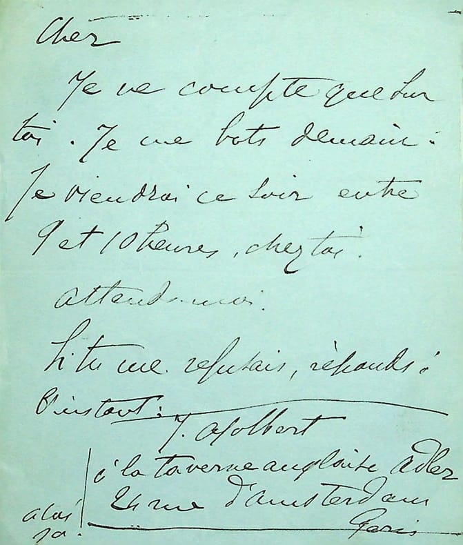 Jean Ajalbert (1863-1947), écrivain, avocat, membre de l'Académie Goncourt. L.A.S., sd [cachet du 31 mai 1908?], 1p in-12. Au docteur et écrivain Maurice de Fleury (1860-1931).« Cher, Je ne compte que sur toi. Je me bats demain. Je viendrai ce soir entre 9 et 10 heures, chez toi. Attends-moi. Si tu me refusais, réponds à l'instant », en donnant l'adresse de la taverne Ader. [391]