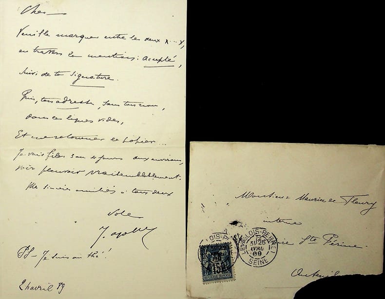 Jean Ajalbert (1863-1947), écrivain, avocat, membre de l'Académie Goncourt. L.A.S. + enveloppe, 24 avril 1889, 1p in-8. Au docteur et écrivain Maurice de Fleury (1860-1931). Il lui envoie un papier à signer. [391]