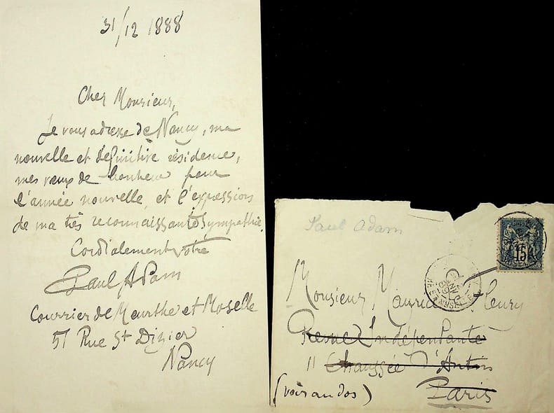 Paul Adam (1862-1920), écrivain. L.A.S. + enveloppe, 31 décembre 1888, 1p in-8. Au docteur et écrivain Maurice de Fleury (1860-1931). « Cher Monsieur, Je vous adresse de Nancy, ma nouvelle et définitive résidence, mes voeux de bonheur pour l'année nouvelle et l'expression de ma très reconnaissante sympathie ». Il est intéressant de noter qu'il pensait s'installer définitivement à Nancy. Il s'y présenta même à la députation en 1889 (septembre) aux côtés de Maurice Barrès mais sans succès. [392]