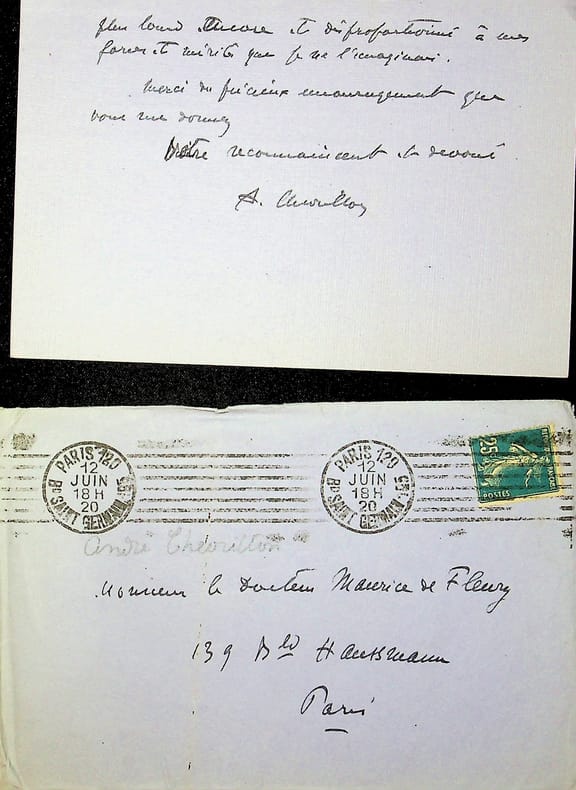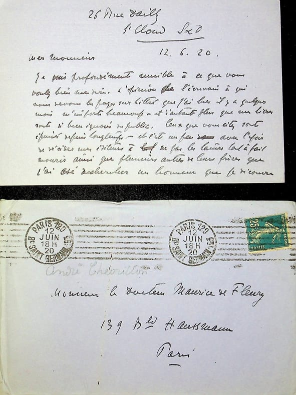 André Chevrillon (1864-1957), écrivain, membre de l'Académie française. L.A.S. + enveloppe, 12 juin 1920, 2p in-12. Au docteur et écrivain Maurice de Fleury (1860-1931). Belle lettre de remerciements pour un courrier de Fleury sur un de ses livres. [392]