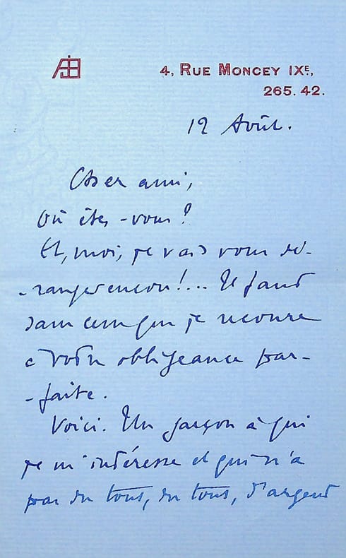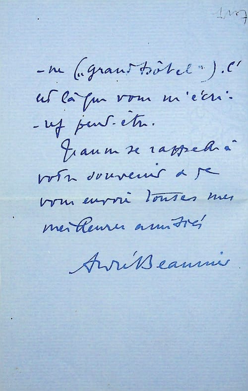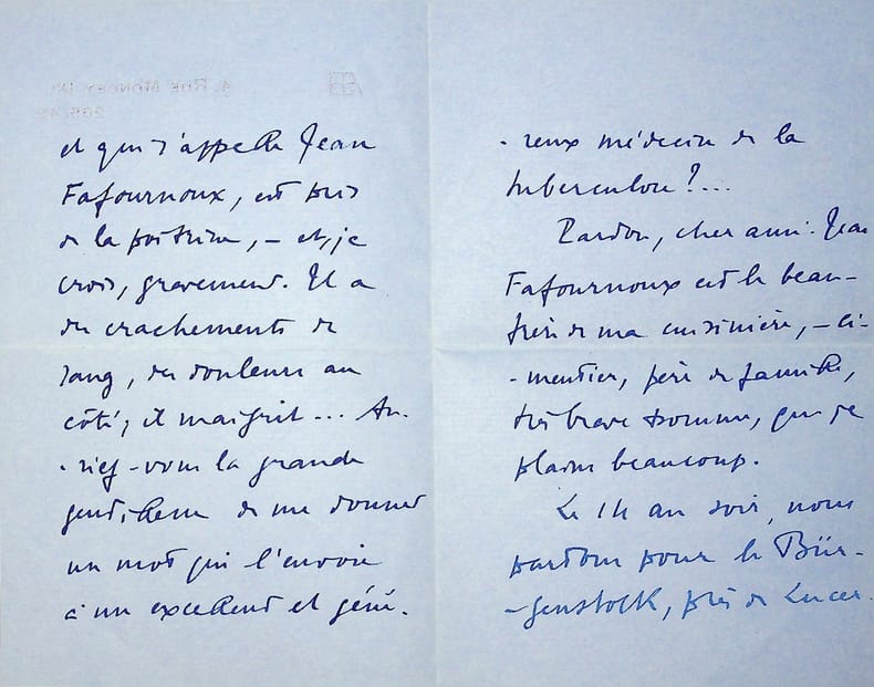 André Beaunier (1869-1925), écrivain. L.A.S., 12 août, 4p in-8. Au docteur et écrivain Maurice de Fleury (1860-1931). Il lui recommande un garçon, Jean Fafournoux, beau-frère de sa cuisinière, atteint de tuberculose, pour qu'il l'envoie à un médecin spécialisé. [392]