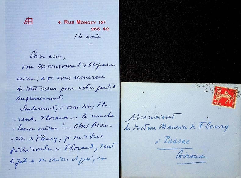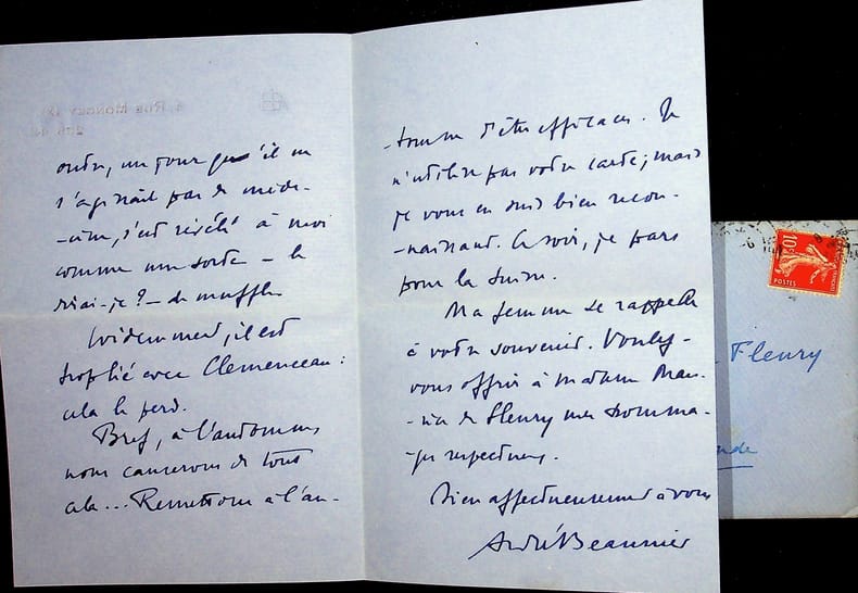 André Beaunier (1869-1925), écrivain. L.A.S., 14 août, 3p in-8. Au docteur et écrivain Maurice de Fleury (1860-1931). Lettre amicale, il est fâché contre un Florand, il part pour la Suisse. [392]