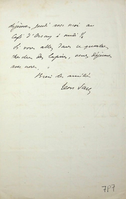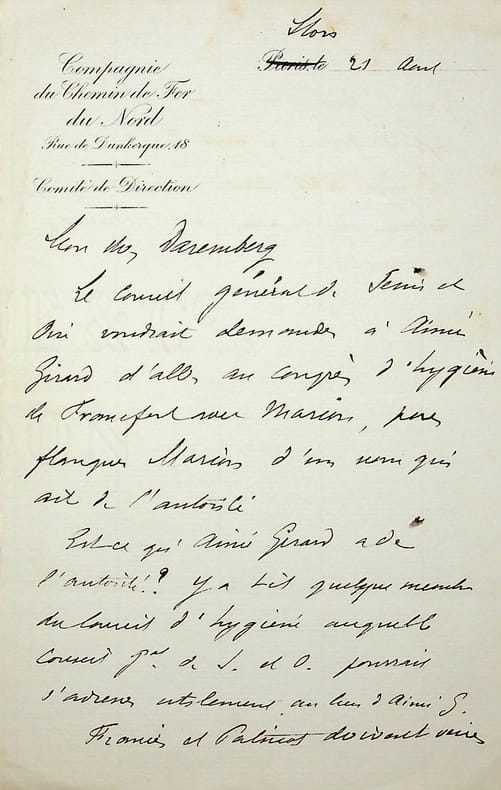 Léon Say (1826-1896), économiste, homme d'état. L.A.S., 21 août [1888], 1p 1/2 in-8. Au médecin Charles-Victor Daremberg (1817-1872). « Le conseil général de Seine et Oise voudrait demander à Aimé Girard (1830-1898) d'aller au congrès d'hygiène de Francfort avec Marion, pour flanquer Marion d'un nom qui ait de l'autorité. Est-ce qu'Aimé Girard a de l'autorité ? Y a-t-il quelque membre du conseil d'hygiène auquel le conseil général de S. et O. pourrait s'adresser utilement au lieu d'Aimé G. . ». Marion, ingénieur des ponts et chaussées, fut bien le représentant de la France en octobre à Francfort. Toutefois nous n'avons pas trouvé qui l'a accompagné. [394]