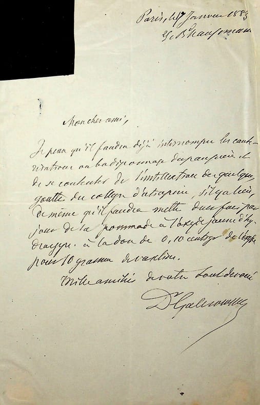 Xavier Galezowski (1832-1907), médecin, ophtalmologue polonais, établi à Paris. L.A.S., Paris, 17 janvier 1883, 1p in-8. Au médecin Charles-Victor Daremberg (1817-1872) autour d'un traitement de l'oeil. « Mon cher ami, Je pense qu'il faudra déjà interrompre les cautérisation ou badigeonnage de paupière et de se contenter de l'[mot illisible] de quelques gouttes. ». Découpe à l'angle supérieur gauche. [394]