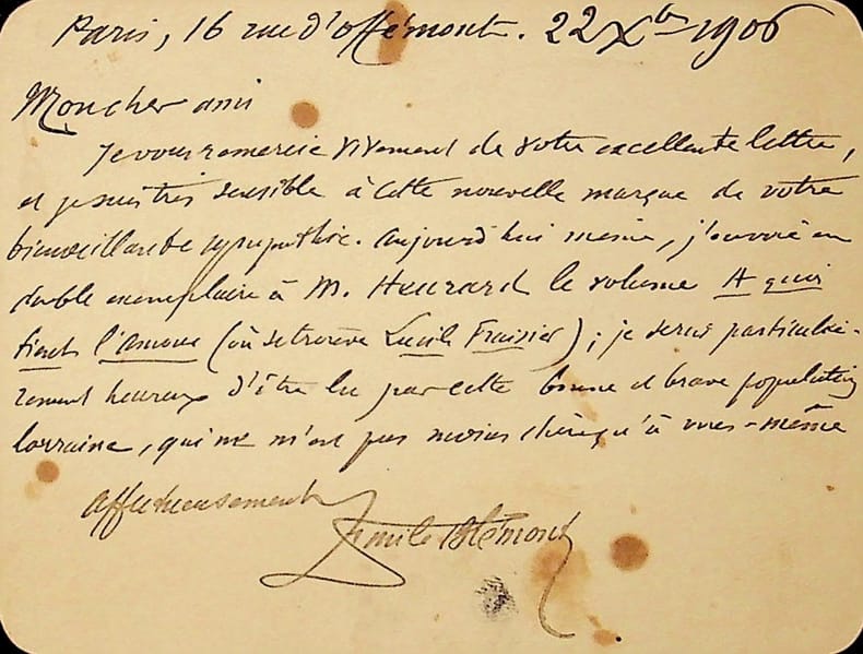 Emile Blémont (1839-1927), poète, écrivain. L.A.S., 22 décembre 1906, 1p in-12. Il fait envoyer deux exemplaires de son livre A quoi tient l'amour (publié en 1903) à M. Heurard. « je serai particulièrement heureux d'être lu par cette bonne et brave population lorraine ». [394]