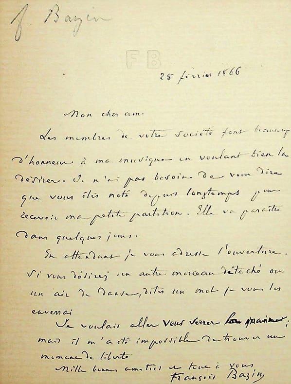 François Bazin (1816-1878), compositeur, pédagogue, Grand Prix de Rome. L.A.S., 28 février 1866, 1p in-12. « Mon cher ami, Les membres de votre société font beaucoup d'honneur à ma musique en voulant bien la désirer. Je n'ai pas besoin de vous dire que vous êtes noté depuis longtemps pour recevoir ma petite partition. Elle va paraître Das quelques jours. En attendant, je vous adresse l'ouverture. Si vous désirez un autre morceau détaché ou un air de danse, dites un mot, je vous les enverrai. Je voulais aller vous serrer la main mais il m'a été impossible de trouver un moment de liberté. Mille bonnes amitiés et tout à vous. François Bazin ». [394]